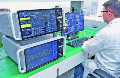 10月15日,在广东深圳举行的2025湾区半导体产业生态博览会(湾芯展)上,我国自主研发的新一代超高速实时示波器正式发布,其带宽突破90GHz、达到国际先进水平,这标志着全球电子通信产业迎来超高速信号“中国标尺”。示波器是科技与产业上游的关键装备,广泛应用于产品科学研究、开发测试和生产制造,它将肉眼看不到的电信号变换成看得见的图像,是工程师和科学家的“眼睛”“标尺”。超高速实时示波器的创新突围,有利于进一步推广“中国标准”,在半导体、6G通信、光通信、智能驾驶等领域前景广阔。图为实验室人员进行低轨卫星通信测量。